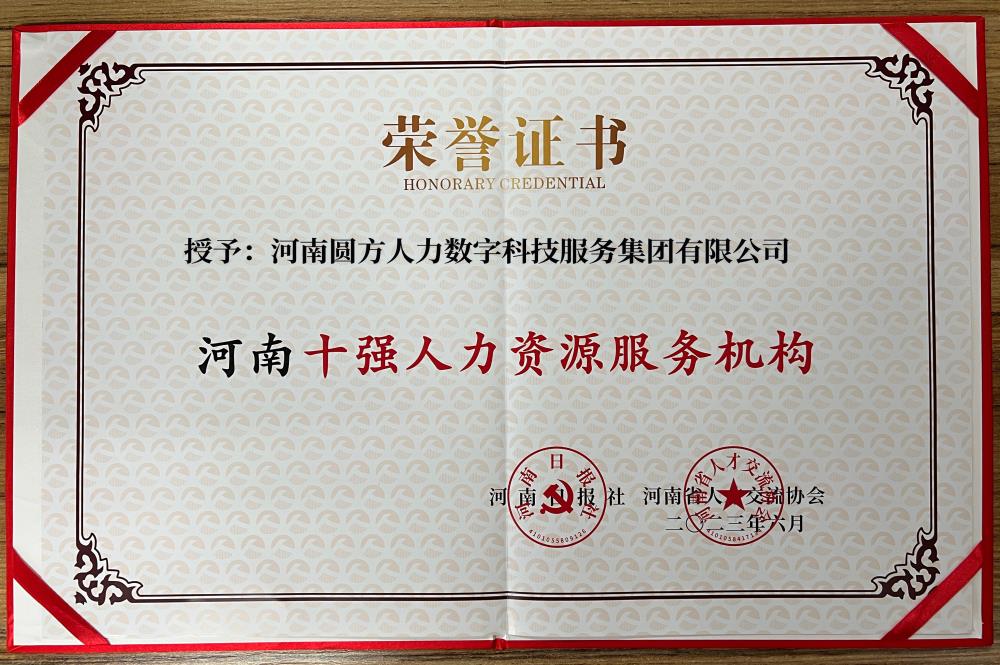 2023年6月15日,由河南日報社、河南省人才交流協(xié)會(huì )聯(lián)合主辦的河南人才論壇在鄭州舉行,河南圓方人力數字科技服務(wù)集團有限公司榮獲“河南十強人力資源服務(wù)機構”榮譽(yù)。