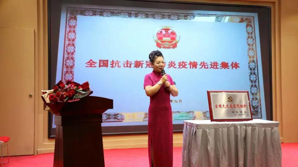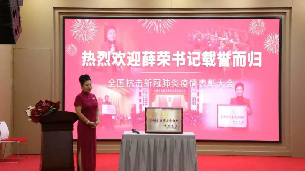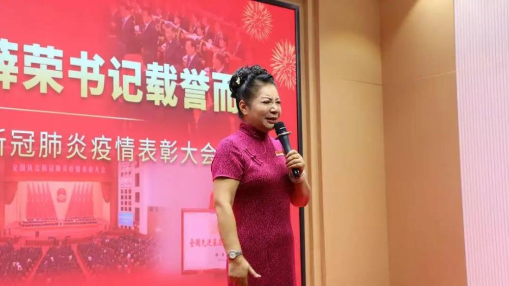 在會(huì )議室里,她與職工一起重溫全國抗疫表彰大會(huì )視頻,看著(zhù)視頻中的自己上臺接受?chē)翌I(lǐng)導人表彰的鏡頭,她再次激動(dòng)地落淚,全體員工也都心潮澎湃,掌聲不斷。
